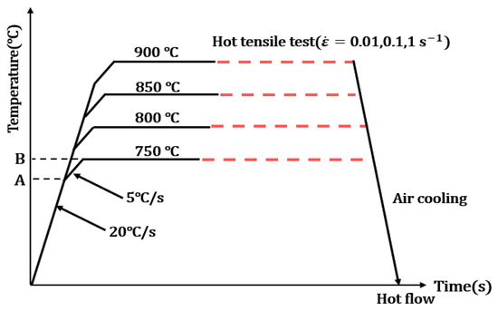 Before testing, thermocouples were welded to the centre of the specimen to measure the temperature and provide feedback to the Gleeble 3800 equipment, such that the designed heating rate and the target deformation temperature were accurately controlled. Figure 3 illustrates the temperature–time profiles of hot uniaxial tensile tests. The temperatures of hot tensile tests are designed at 750 °C, 800 °C, 850 °C and 900 °C, ranging from warm (~0.4–0.6 ) to hot (>0.6 ) forming conditions. Note that stands for the melting temperature of TA32. To avoid overheating the specimen due to fast electrical resistance heating, a two-step heating strategy was adopted, with a heating rate of 20 °C/s in the first step and reduced to 5 °C/s until the target temperature was reached. After heating, the specimen was soaked at the target temperature for the 60 s to guarantee the temperature stability in the uniform temperature zone of the specimen. The strain rates of hot tensile tests were performed at 0.01/s, 0.1/s and 1/s, which are the typical rates for the hot stamping and hot gas forming of titanium alloys. Each condition has been repeated three times to obtain reliable results. The reliability and repeatability of tests were also ensured by the evaluation of temperature and strain rate histories.