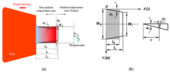 Figure 4 shows the geometrical model of the non-uniform temperature zone of the Gleeble tensile specimen. Taking a half specimen for analysis due to the geometric symmetry as shown in Figure 4a, the uniform temperature zone and the non-uniform temperature zone are defined along the longitudinal direction of the specimen. In this correction model, it is assumed that material in the uniform temperature zone is stretched uniformly in the longitudinal and contracted in the width direction. For the rest of the specimen in the non-uniform temperature zone, the section shape gradually changes from the initial rectangle to the trapezoid, as schematically shown in Figure 4a. The principle of the proposed correction method is to calculate the length of the non-uniform temperature zone, which evolves with time during the test. Provided with the total stroke from the facility, the length of the uniform temperature zone could be achieved by subtracting the non-uniform zone from the total stroke. The calculated length of the uniform temperature zone, which also evolves with time, will be used as the gauge length for subsequent calculation of the true strain levels and, hence, the true stress-strain curves.