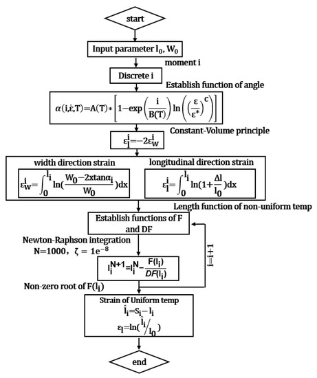 According to the volume consistency principle, for the non-uniform temperature zone, the length strain is equal to twice of width strain of the non-uniform temperature zone. The correlation can be established using Equation (5).