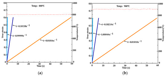 Verification of strain rates and temperatures using Gleeble tensile testing: (a) 800 °C; (b) 900 °C.