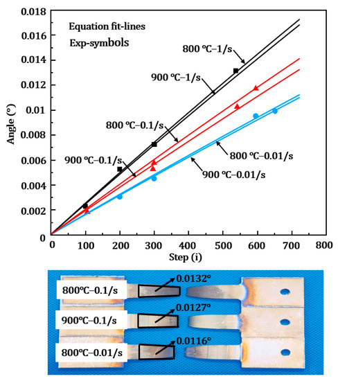 In this section, the evolution of the experimental angle, , during deformation at the designed temperature (i.e., 800 °C and 900 °C) and strain rates (0.01/s, 0.1/s and 1/s) are presented as symbols in Figure 7. For temperature determination, the designed temperature are selected based on industrial hot forming conditions for titanium alloys, which is 0.4–0.6 . Both temperatures are determined based on the industrial range. The experimental angles are calculated using Equation (1), where the values are measured. These data were used to calibrate the proposed angle evolution model in Equation (2). The determined angle equation parameters are given in Table 2.