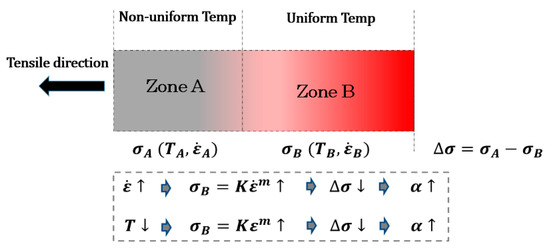 At a low temperature and a high strain rate, the flow stress of zone B becomes higher. Then the difference of stress, , between zones A and B is smaller. This results in a larger deformation of the non-uniform zone and, hence, higher values. Thus, a low temperature and high strain rate cause larger non-uniformity of the specimen.