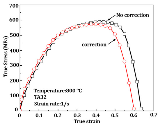Experimental stress-strain curves with and without correction. The temperature is 800 °C, and the strain rate is 1/s.