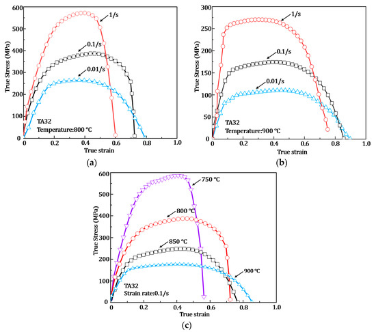 True stress-strain curves of the TA32 at different temperatures and strain rates after correction: (a) 800 °C; (b) 900 °C; (c) 0.1/s.