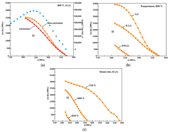 The hardening stages could be identified from the plotted vs. curves in Figure 12. It can be seen that the hardening rates continuously decreases with increased flow stresses, due to the gradually saturated dislocation density. Figure 12a again compares the hardening rates before and after correction. The hardening rates of the corrected stress-strain curves are lower than those before correction, indicating an overestimation of the hardening behaviors using the traditional data processing method. Figure 12b,c gives the hardening rate curves under 800 °C (0.01/s, 0.1/s and 1/s) and 0.1/s (750 °C, 800 °C and 850 °C) after correction. As expected, a lower temperature and higher strain rate enhanced the hardening behavior and, hence, higher hardening rates. These generally accepted trends are still applicable to the hardening rate behaviors after correction.