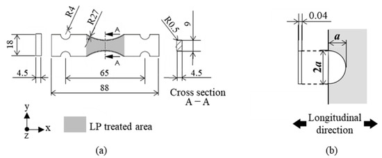 The defect size that can be rendered harmless by LP was evaluated based on the fracture mechanics, assuming that the semicircular slit was equivalent to a semicircular crack. It was assumed that the positive value of the stress intensity factor Δ K T contributed to fatigue crack propagation. Δ K T can be calculated using the following equation [22,24]: