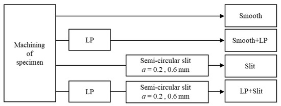 Figure 2 depicts the flowchart of the machining process of the bending-fatigue test specimens and the types of specimens used in the fatigue tests. The specimens were categorized into four groups: untreated smooth specimens (Smooth), LP-treated smooth specimens (Smooth + LP), specimens with a semicircular slit (Slit), and specimens with a semicircular slit after LP treatment (LP + Slit).