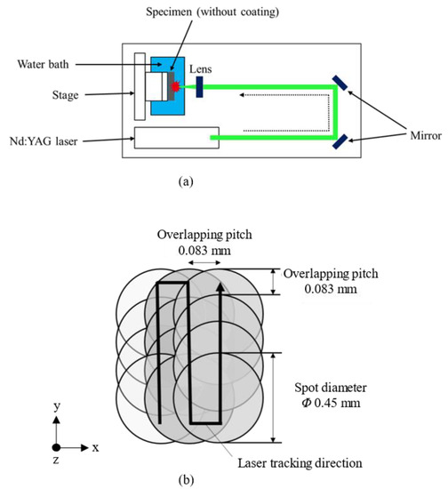 Figure 3a shows the setup of the LP device. LP was performed on specimens immersed in water. Coating was not applied on the specimen surface. The second harmonic of the Q-switched Nd: YAG laser was used for LP on both sides of the specimen. Figure 3b shows the laser tracking during LP. The laser beam was irradiated on the specimen in the y-direction (width), followed by the x-direction (longitudinal), in a layer. Table 2 lists the applied LP conditions. The main parameters of LP include the laser pulse energy (Ep), laser spot diameter (D), and laser pulse density (Np). The power density (G) and coverage (Cv) were calculated using these values and the pulse duration (t) [26].