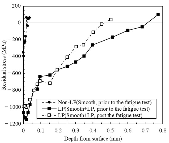 To investigate the influence of cyclic loading on the stability of the compressive residual stress, the residual stress distribution in the Smooth + LP specimen was measured after fatigue testing at the fatigue limit (depicted by the open squares in Figure 4). The compressive residual stress is redistributed by cyclic loading and decreases to 990 MPa on the surface after the test. Furthermore, the maximum compressive residual stress decreases to 1000 MPa and the crossing point shifts from 0.70 mm to 0.45 mm. As shown in Figure 8, Figure 9 and Figure 10, the fatigue crack initiation point is located deeper than the crossing point in most of the specimens. This behavior is due to compressive residual stress.