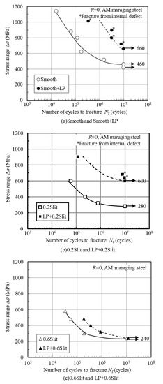 Figure 6. S–N diagrams of the (a) Smooth and Smooth + LP, (b) 0.2 Slit and LP + 0.2 Slit, and (c) 0.6 Slit and LP + 0.6 Slit specimens.