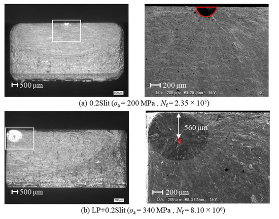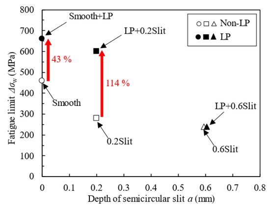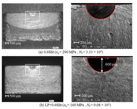 As shown in Figure 7, the fatigue limit of the LP + 0.2 Slit specimen increases to 91% of that of the Smooth + LP specimen, and two among the three specimens are fractured outside the slit. Thus, both conditions (a) and (b) are satisfied for the LP + 0.2 Slit. However, neither condition is satisfied for the LP + 0.6 Slit specimen. These results indicate that less than 0.2 mm deep semicircular slits can be rendered harmless by LP.