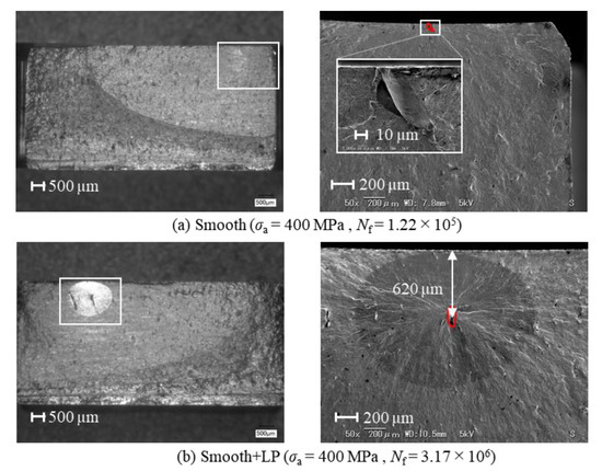 As shown in Figure 8b and Figure 9b, for the LP specimen, fatigue crack initiation near the surface is suppressed by compressive residual stress, improving the fatigue limit, and rendering the defect harmless. In addition, the increase in surface hardness shown in Figure 5 contributes to fatigue strength improvement. The increase in surface roughness shown in Section 3.1 can generally be a factor in lowering the fatigue limit. However, surface roughness does not affect the fatigue strength of LP specimens because crack initiation from the surface is suppressed.