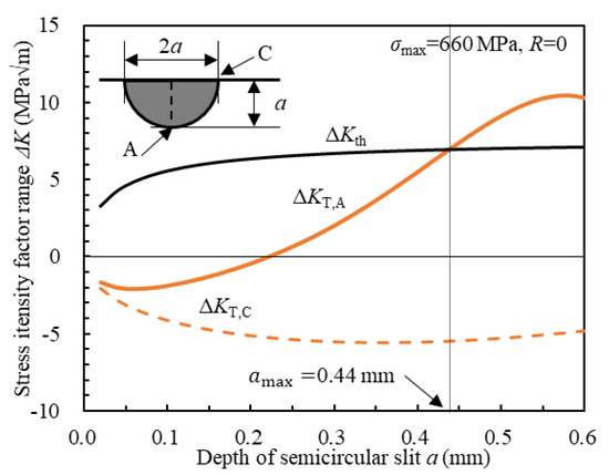 Figure 11 displays the relationship between Δ K T and the crack depth for a semicircular crack. Δ K T , A and Δ K T , C correspond to Δ K T at the deepest and surface points of the semicircular crack, respectively. As the sizes of the cracks in this study were small, the threshold stress intensity factor range Δ K th was dependent on the crack size.