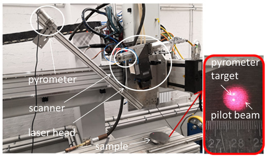 Laser processing was carried out using a laser technological complex with continuous radiation with a wavelength of 1.07 µm generated by a 16 kW fiber ytterbium laser LS-16 (IPG Photonics, Oxford, MA, USA). The surface temperature of the sample was measured during hardening in the laser beam treatment zone using an optical pyrometer CT Laser 3MH2-SF (Optris, Berlin, Germany). The pyrometer operates in the range of 200–1500 °C, the distance between the measuring target of the pyrometer and the center of the laser beam spot was 1 mm. This scheme allows you to measure the temperature at the level of the hardening temperature without melting for the selected steel grade. Location of the laser head YW50 ZK (Presitec, Gaggenau, Germany), the pyrometer and the sample during the experiments can be estimated from Figure 1.