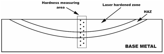 Hardness and microhardness measurements were carried out on microhardness tester series FM-310 (Future Tech, Kawasaki, Japan) with a load of 2000 g and 300 g a Vickers equipped with an image analyzer «Thixomet Pro» (Thixomet, St. Petersburg, Russia). The hardness in the depth of the hardened layer was determined at a load of 2000 g, offset from the surface by 50 µm, and with a step between the prints of 150 µm, Figure 2.