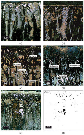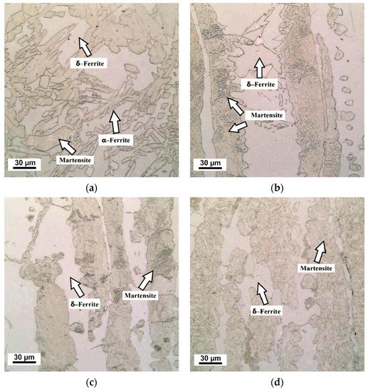 The structural components of the base metal represent tempered martensite and δ-ferrite in all samples Figure 6d. The microstructure in the HAZ (Figure 6c) represents martensite and δ-ferrite, in the quenched zone Figure 6b—martensite and δ-ferrite and its partial transition to martensite component. In the samples where melting of the upper boundary was observed as a result of temperature overheating, there is partial decay of δ-ferrite and partial formation α-ferrite Figure 6a, martensite forms a granular mixture. The average microhardness of martensite in the hardened zone was (440–480 HV0.3), in the base metal (300–330 HV0.3), δ-ferrite in the hardened zone (250–278 HV0.3), in the base metal 220–250 HV0.3). Extended areas of δ-ferrite are preserved at ambient temperature, the effect of δ → γ-conversion on the subsequent γ → α-conversion in 14Cr17Ni2 steel subjected to laser hardening. The stainless steel has a large biphasic region (δ + γ), and significant δ-ferrite content can persist at ambient temperature. The γ-phase formed was metastable and converted to α-phase upon further cooling. Partial formation of high-energy interfaces δ/γ, which contributed to γ-to α-ferrite conversion occurring at a relatively higher temperature, and to some extent reduced the hardness of laser hardening.