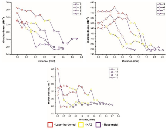 High hardness was obtained in modes No. 4, 6, 7, Figure 8, also on these samples the greatest depth of the hardened zone was obtained. In multipass hardening, the highest hardness was obtained in the mode with two passes and at linear energy of 0.28 kW*s/mm, mode No. 11. The greatest depth of the hardened zone was obtained at a rate of energy input of 0.42 kW*s/mm, mode 12. At hardening with four passes, the greatest depth and high hardness was reached with the rate of energy input 0.28 and 0.42 kW*s/mm mode No. 13 and 14, Figure 8.