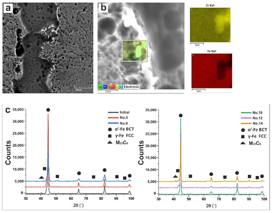 (a) SEM micrographs showing M23C6 carbides distributed inside the ferrite matrix. (b) SEM-EDX mapping the molar fraction of Cr over the area specified in (a). (c) X-ray diffraction pattern that confirms the crystallographic structure.