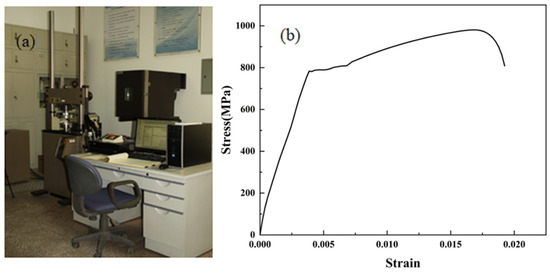 (a) Picture of the tensile testing machine. (b) The stress–strain curve of B700L automotive beam steel.