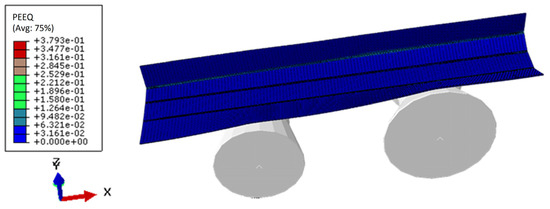 In this paper, the COPRA2021 software from the German company data M company (Valley, Germany) was used to design the roll pattern, and the generated roll pattern diagram was imported into the ABAQUS2017 software from the American company DS SIMULIA company (Providence, USA) for roller design. In order to simulate the actual roll forming process, the length of the sheet was set to 900 mm, and the sheet was set as a deformable body. The mesh used C3D8R solid elements [10,11], and the thickness direction was divided into two layers, with a total of 11,340 elements. The roller was set as an analytical rigid body and the roller was angle-relieved [12], the diameter of the upper roller was set to 150 mm, the diameter of the lower roller was set to 100 mm, and the diameter of the vertical roller was set to 100 mm. The pass spacing between the rollers was set to 350 mm. General contact was selected between the roller and the plate, and the friction coefficient was set to 0.2 [13]. The assembly drawing of the “b”-shaped cross-section model is shown in Figure 7. The above simulation conditions and workpiece geometry are shown in Table 2.