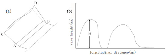 During the roll forming process, the sheet moves along its forming direction, as shown in Figure 2. Different roll angles will cause different deformations of the sheet in different parts in the forming direction. The edges of the sheet will be elongated due to the increase in height. The space curve CD is longer than the straight line AB in the plane area. Because different parts of the profile have different paths between the two passes, the path length of the side is often greater than the straight-line distance between the two passes. Therefore, the actual formation boundary is inconsistent with the theoretical formation boundary. The outer edge of the sheet is wavy; that is, an edge wave defect is formed. A schematic diagram of an edge wave is shown in Figure 3a. In this paper, the edge wave defects created in the roll forming process were evaluated by the sum of wave heights generated at 100–800 mm in the sheet forming direction. The schematic diagram is shown in Figure 3b, and the calculation formula is: