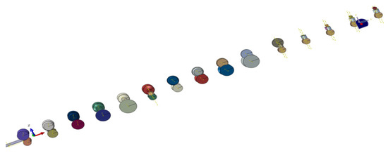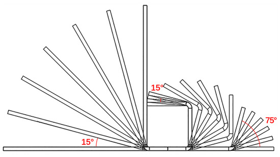 The roll pattern is a schematic cross-sectional view of the roll forming unit when the sheet is formed. The forming sequence of the “b”-shaped cross-section was designed through the roll pattern design module of COPRA, as shown in Figure 5. The rounding radius was 5.0 mm, the thickness of the sheet was 2.0 mm, and the outside angle was first formed to 75°, with a total of five passes. Then, the two inner corners were formed to 90°, with a total of six passes. Finally, remaining outside corners that were not yet formed were shaped, and each pass was formed at 5° for a total of 3 passes. With the addition of the guide roll of the first pass, the total number of forming passes was 15 passes. The sheet metal passed through each roll from the first pass, and finally passed through the fifteenth pass to form the required cross-sectional shape.