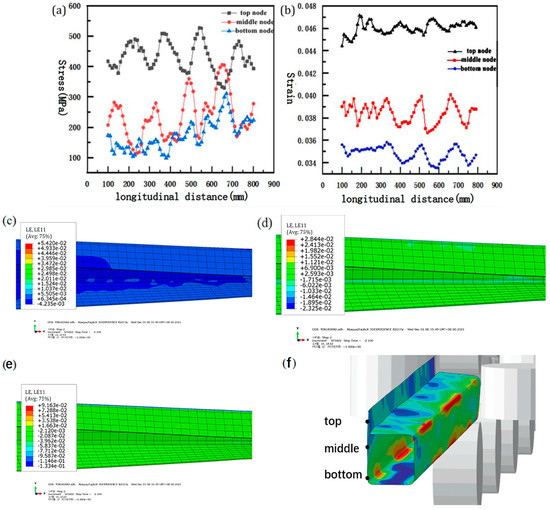 It can be seen from the simulation results that the front flange of the pipe tends to shift to the inside. This is due to the complex deformation force of the sheet metal when the rolls are engaged during the roll forming process. Therefore, in order to ensure the accuracy of the simulation results, the stress change at the flange at 100–800 mm in the length direction of the sheet was selected to be measured. As shown in Figure 8, the stresses at the top, middle, and bottom nodes of the flange are distributed within the longitudinal distance. It can be seen that the stress relationship is greatest at the top of the flange, followed by the middle of the flange, and is lowest at the bottom of the flange. It can also be seen from the figure that the stress and strain curves at the top node of the flange have greater volatility and peak values than the stress and strain curves at the middle and bottom nodes, indicating that the longitudinal stress and strain distribution at the top of the flange is the most uneven, and the longitudinal stress and strain at the bottom of the flange are the same. The strain distribution is the most uniform. Therefore, the top of the flange is most prone to edge wave defects.