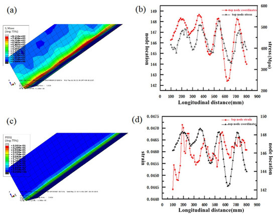 (a) Cloud map of Mises stress for “b”-shaped pipe. (b) The changing curve of the stress and coordinates of the joints at the top of the sheet metal with the longitudinal distance. (c) Cloud map of equivalent strain for “b”-shaped pipe. (d) The changing curve of the strain, the coordinates of the joints at the top of the sheet metal, and the longitudinal distance.
