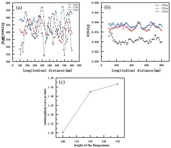 In order to explore the influence of different flange heights on the edge waves of roll forming parts, the parameters set in the simulation were as follows: the sheet thickness was 3 mm, the forming speed was 300 mm/s, and the flange heights were selected as 100 mm, 120 mm and 140 mm. Figure 10a,b show the variation curves of equivalent stress and equivalent strain of the top node of the sheet with longitudinal distance under different flange height conditions. Figure 10c shows under the condition of this processing parameter, the variation curve of the sum of wave heights generated.It can be seen from the figure that as the height of the flange increases, the maximum equivalent stress and strain values of the top node increase, and the increase in the height of the flange will have an adverse effect on the forming process, resulting in aggravated edge wave defects at the flange. This is because an increase in the height of the flange will increase the edge tension of the stretching zone, the compression at the edge of the compression zone will also increase, and the increase of the edge compression will directly lead to greater edge wave defects. Therefore, in the actual manufacturing process, we can control the edge wave by reducing the height of the flange on the basis of meeting the size requirements of the part.