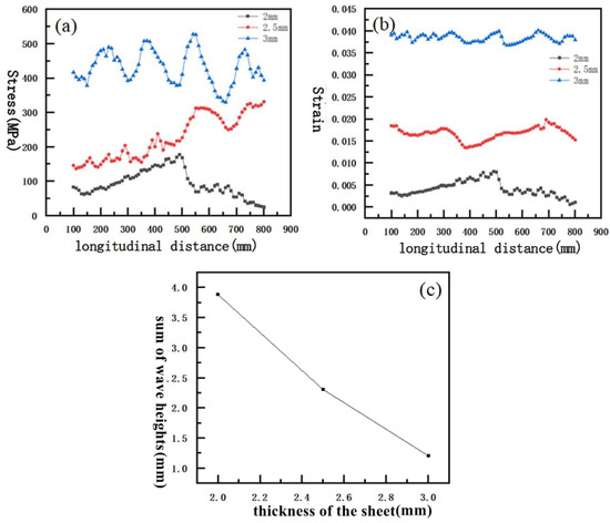 In order to explore the influence of different sheet thicknesses on the edge wave of roll forming steel, the parameters set in the simulation were as follows: the flange height was 100 mm, the forming speed was 300 mm/s, and the sheet thicknesses were 2 mm, 2.5 mm and 3 mm. Figure 11a,b show the curves of equivalent stress and equivalent strain of the top node of the sheet with the longitudinal distance under different sheet thickness conditions. Figure 11c shows the curve of the change of the sum of wave heights with the thickness of the sheet. It can be seen from the figure that as the thickness of the sheet increases, the required stress during sheet deformation increases, while the sum of wave heights gradually decreases. This is because the increase in sheet thickness increases the forming rigidity of the outer flange, thereby improving its ability to resist edge wrinkles and reducing the occurrence of edge wave defects. Therefore, thicker plates can produce higher-quality wide profiles. Therefore, in actual processing, on the basis of meeting the required thickness of the parts, we can increase the thickness of the plate to reduce the occurrence of edge wave defects.