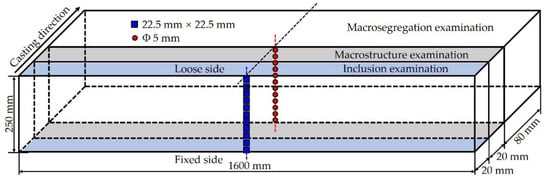 In this study, the medium carbon structural steel 45# was produced by a vertical bending continuous caster in a Chinese steel plant; the chemical compositions of the steel are listed in Table 1. In order to avoid the deviation caused by fluctuation during casting process, a slab sample with 120 mm length was collected under the steady state casting conditions. The details of the casting parameters during sampling are given in Table 2. The slab sample was cut into three pieces for different tests as shown in Figure 1, including the analysis of inclusions, microstructure, element segregation, and macrostructure.