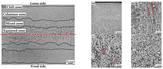 Macrostructure of the partial slab transverse section of medium carbon structural steel 45#. (a) Chill zone, (b) columnar zone, (c) mixed zone and (d) equiaxed zone.