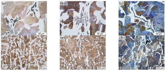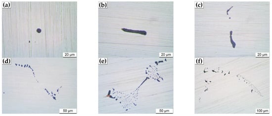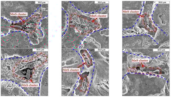 As the MnS inclusions are formed at the end of solidification, it can be inferred that they may have some impact on the subsequent solid-state phase transformation. The observed microstructure after etching together with MnS inclusions are presented in Figure 12. Shim et al. [46] reported that coarse MnS particles are inert to the nucleation of intragranular ferrite, and Lin et al. [47,48] suggested that the size of MnS inclusion acting as the nucleation site for ferrite should be smaller than 10 μm. However, Figure 12a–c indicates that ferrites can be formed on dendritic MnS inclusions, even if the average diameter of the inclusion exceeds 52 μm. Figure 12d–f shows that the distribution of MnS inclusions significantly affects the growth of the ferrites and destroys the uniformity of the microstructure, which is likely to cause the anisotropy of mechanical properties of the steel. In other words, this also means that it has great potential to improve the microstructure by controlling the size and distribution of MnS inclusions.