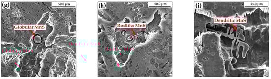 There are considerable differences in the morphology of MnS inclusions examined in the studied 45# steel slab. Figure 3a,g shows the typical randomly dispersed globular MnS (Type I) which was mainly observed at the edge of the slab. The sizes of the spherical MnS inclusions are significantly smaller than the others found in the remaining area of the slab. It is shown in Figure 4a,b that the quantity density of MnS inclusions in the slab edge samples are the largest but minimum in average diameter due to the dominance of spherical MnS in this area. This can be explained by that the cooling rate of slab edge is the greatest during the continuous casting process. The greater the cooling rate, the larger the degree of supercooling [26]. The large supercooling caused by the high cooling rate will promote the nucleation of MnS inclusions, resulting in a large number of fine globular MnS. That is, the cooling rate plays a critical role in the size and quantity of Type I MnS inclusion, which is consistent with the previous studies [27,28,29]. In addition to globular MnS, rodlike MnS (Figure 3b,c,h) and dendritic MnS (Figure 3d–f,i) classified as Type II were also observed. The former is mainly distributed in the columnar zone of the slab, and the latter is presented in the mixed zone and equiaxed zone. Takada et al. [11,17] suggested that the transition of MnS inclusion from Type I to Type II occurred when the sulfur content exceeded 0.05%. Imagumbai [16] and Olkawa et al. [7] also found the Type II MnS inclusions in steels with a sulfur content of 0.073% and 0.3%, respectively. However, a great amount of Type II MnS inclusions was observed in the studied steel with the sulfur content far less than 0.05%. The reasonable explanation is that the solidification cooling rate inside the thick slab is quite small, which gives MnS inclusions sufficient time to grow up and finally transform to dendritic shapes. Therefore, the cooling rate is also one of the main factors affecting the growth of Type II MnS inclusion.
