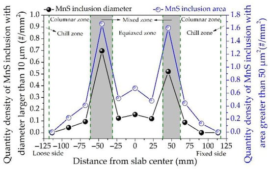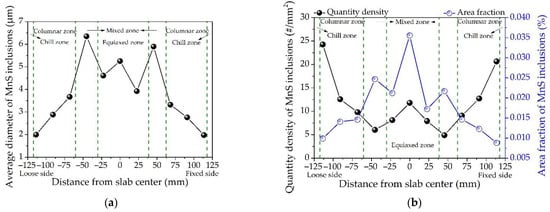 During the continuous casting process, the cooling rate along the slab thickness direction varies greatly, accompanied by the different growth behavior of MnS inclusions. As shown in Figure 4, the diameter and area fraction of inclusions gradually increase from the slab edge to the mixed zone, while the quantity density decreases accordingly, and they all reach the peak in the mixed zone. The average diameter of MnS inclusions presents the maximum value of 6.35 μm in the mixed zone near the loose side, which is 2.47 μm larger than that in the entire slab thickness. Moreover, the area fraction of MnS inclusions in the same position is 0.025%, which is the second maximum value. In the equiaxed zone, the average diameter, quantity density and area fraction of MnS inclusions increase as the distance from the center of slab decreases. The area fraction of MnS inclusions has the maximum value of 0.036% in the slab center, while the average value along the slab thickness is 0.018%.