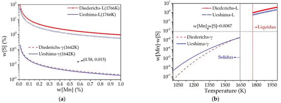 where KMnS is the equilibrium constant of reaction (1), and the corresponding equilibrium solubility products for MnS in liquid and γ-iron phase are presented in Table 4. aMnS, a[Mn] and a[S] are the activity of MnS, Mn and S, respectively; aMnS is taken as one for the formed pure MnS; fn is the activity coefficient of the solute element n, which is calculated by Equations (3) and (4) [34]; w[Mn], w[S], w[n] and w[m] are the mass fractions of solute elements Mn, S, n and m; is the interaction coefficient of element m to n, which is given in Table 5. The liquidus and solidus temperature of the 45# steel are 1766 K and 1642 K, respectively, which were calculated by Equations (5) and (6) [1].