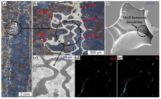Relationship between MnS inclusions and solidification structure in the slab of medium carbon structural steel 45# revealed by experimental observation. (a,b) microstructure, (c–e) element mapping results, (f) MnS inclusion observed between dendrites.