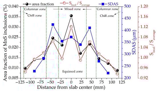 The precipitation of MnS inclusions at the end of solidification is heavily dependent on the local sulfur content in the residual liquid and the secondary dendrite arm spacing in different macrostructure zones. Therefore, the sulfur content and secondary dendrite arm spacing along the slab thickness of the 45# steel were measured. The comparison between the measurement results and the area fraction of MnS inclusions is shown in Figure 9. Where Slocal/Saverage presents the segregation index of sulfur.