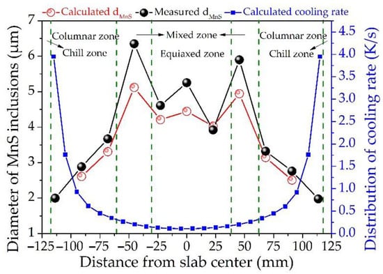 Comparison between the calculated and measured diameter of MnS inclusions, as well as the calculated cooling rate along the slab thickness of the 45# steel, are displayed in Figure 10. In the columnar zone, the diameter of MnS inclusion is negatively correlated with the cooling rate, that is, the inclusion size gradually increases with the decrease in the cooling rate. In the mixed and equiaxed zone, the influence of cooling rate on the MnS inclusion size is weakened, while the sulfur content and SDAS play a crucial role in the growth. The evolution trend of the calculated diameter of MnS inclusion is in good agreement with the measured data. The inclusion size increases gradually along the slab thickness toward the center but reaches the maximum in the mixed zone. Large-sized MnS inclusions are more likely to aggregate to have a destructive impact on the performance of the steel. For instance, Yang et al. [44] proposed that micro-cracks occurred in the thickness center of rolling samples were mainly caused by MnS inclusions larger than 10 μm. Wang et al. [45] reported that MnS inclusions with a size of about 20 μm distributed in segregation regions exaggerate the extent of the band microstructure. The calculated value at almost every position is smaller than the measured one, especially in the mixed zone, which may be caused by the gathered inclusions identified as a single inclusion during the detection process, resulting in the dimensional differences.