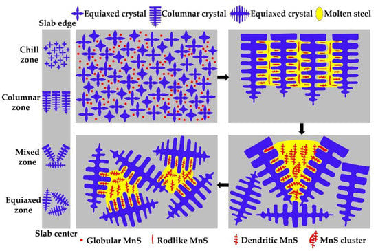 Schematic drawing of MnS inclusion aggregation mechanism along the slab thickness of the medium carbon 45# steel.