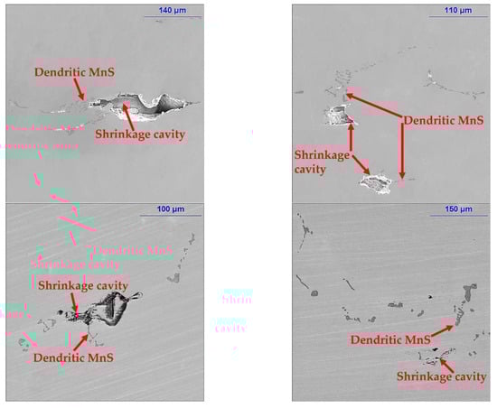 MnS inclusions have good deformation ability and can be deformed into long strips during steel rolling, which will make the mechanical properties of steel anisotropic [30,31]. In addition, the elongated MnS inclusions are likely to act as the nucleation sites and expansion channels of cracks, thereby reducing the mechanical properties of steel [32]. Larger MnS inclusions usually have a detrimental effect on the mechanical properties of steel. Therefore, the distribution of large-size MnS inclusions along the slab thickness of the 45# steel was analyzed, including the quantity density of MnS inclusions with diameter larger than 10 μm or area greater than 50 μm2 as shown in Figure 5. The MnS inclusions with large diameter or area are distributed similarly in the slab. In general, both of their quantities gradually increase along the slab thickness toward the center. In particular, the quantity density of large-diameter and large-area MnS inclusions in the mixed zone near the loose side are 0.70/mm2 and 1.67/mm2, respectively, while in the slab center they are 0.16/mm2 and 0.68/mm2, and the average values are 0.17/mm2 and 0.56/mm2. That is, there are much more large-size MnS inclusions in the mixed zone than in the other positions of the slab. Therefore, the aggregation of MnS inclusions is detected in the mixed zone of the slab. The typical morphologies of MnS inclusions aggregation in the slab of the 45# steel is shown in Figure 6. The types of aggregated MnS inclusions are mainly dendritic, with a small amount in flakes and angular shapes, and the size can be as large as 120 μm. These inclusions could be deformed into long strips in the subsequent rolling process, which are harmful to the steel products.