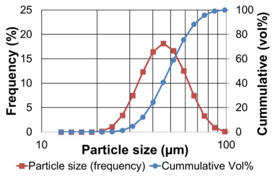 Powder size distribution for Scalmalloy® powder used (averaged over five measurements).