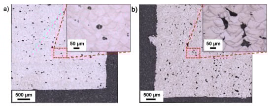 Optical microscopy images showing (a) etched sample printed with high energy (low laser speed) with gas pores causing defects, (b) etched sample printed with low energy (high laser speed) with lack of fusion causing defects. Note that the inset images focus on such defects.