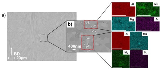 After peak hardening the alloy, some microstructural changes were observed. The grain size and refined grain structure seemed to be intact after this treatment, as can be seen in Figure 9. This meant that recrystallisation of Al-grains did not take place or was relatively insignificant. Secondly, there was some precipitation observed at grain boundaries, which were seen to be rich mostly in Mn, as seen from the two high-resolution EDS maps seen in Figure 9. In some cases, certain enrichment of Mg was also seen in a few precipitates, which could be due to formation of precipitates during heat treatment. Additionally, Figure 10 refers to another type of precipitate. It was seen that one such category of precipitate, seen to be several µm in size, was enriched in Mn and Zr. This could be particles formed during laser processing in the as-printed conditions. It is well known that Zr forms primary precipitates from Al-melt at very high temperatures (around 1000–1100 K depending on composition) and there are thermally stable precipitates after ageing at temperatures as high as 600 K [18].