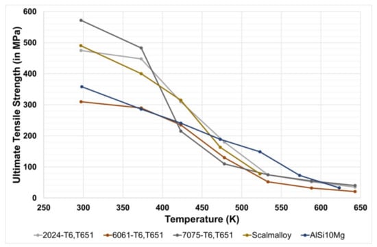Deterioration of ultimate tensile strength of different conventional Al alloys as compared to AlSi10Mg, Scalmalloy® [19,35,36].