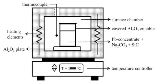 In the present work, as raw material a lead concentrate from Zacatecas State located in the center area of Mexico was used. The concentrate was obtained in a processing polymetallic minerals plant through the traditional unit operations of crushing and milling and then concentrated by a direct froth flotation process. An amount of 500 g of Pb-concentrate was sampled and analyzed. Volumetric analysis was used to estimate the lead content in the used concentrate, where the reactants Xylenol-orange (Merck, Darmstadt, Germany) as indicator and Ethylenediaminetetraacetic acid disodium salt dihydrate EDTA (Merck, Darmstadt, Germany) for titration were used. Besides Atomic Absorption (AA), X-ray Diffraction (XRD), and Scanning Electronic Microscopy (JEOL, Peabody, CA, USA) with Energy Dispersive X-ray spectroscopy (SEM-EDS) technics were used. Reduction experiments for lead recovery were carried out by using a commercial reagent of Na2CO3 with ≥99.5% of purity. Spent crucibles of SiC with high purity (≥99%) were used with a mean particle size of 74–125 microns. Four trials were conducted to constant amounts of 4 g Pb-concentrate and 0.4 g of SiC, while the quantity of Na2CO3 was set to 1.50, 1.92, 2.38, and 2.88 g which correspond to 25, 30, 35, and 40 wt.%, respectively. The reagents for each trial were weighted in a Sartorius TE64 Talent Analytical Balance (Sartorius, Göttingen, Germany), 60 g × 0.1 mg readability, and mixed thoroughly in an agate mortar. The mixtures were charged in alumina crucibles with a capacity of 20 mL, the crucibles were covered with alumina lids. The covered alumina crucibles with the corresponding mixed reagents for each trial were placed in an electrical resistance furnace Thermolyne Mod. 1200 (Thermo Fisher Scientific, Waltham, MA, USA) with control of temperature to within ±10 °C, and each experiment lasted 1 h to 1000 °C. The temperature was measured with a type-K thermocouple. The experimental setup for lead recovery from a lead concentrate with Na2CO3 and SiC to 1000 °C is shown in Figure 1.