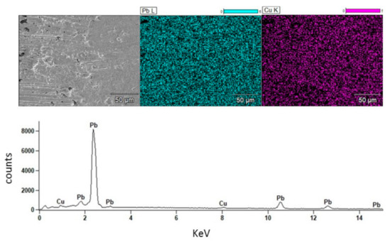 Figure 7 shows the elemental mappings analysis obtained for the metallic phase for the experiment carried out with 40% by weight Na2CO3 and 0.4 g of SiC to 1000 °C. The microanalysis shows mainly Pb and Cu. It is possible to observe that both Pb and Cu are uniformly distributed throughout the analyzed surface. Copper is normally found in crude lead produced by the pyrometallurgical route and then it is separated in the refining process for its further recovery, which is done either by air injection and mechanical removing or even by S addition for the case of low copper concentrations [13]. The copper removing operation is done to temperatures just above the melting point of lead.