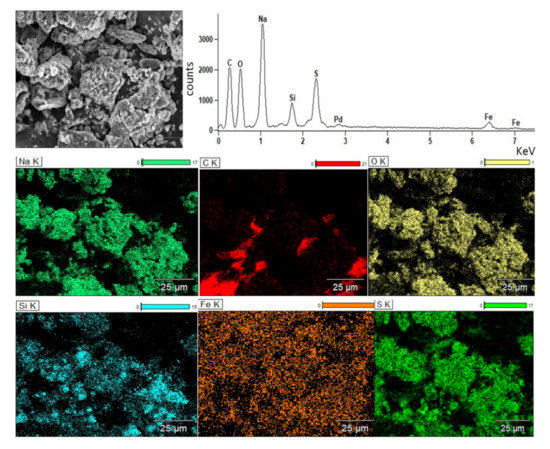 Figure 9 shows the SEM-EDS results of the slag obtained for the trial carried out for an addition of 40 wt.% Na2CO3. The resulting slag phase is composed of agglomerated particles that contain mainly Na, C, O, Si, S, and Fe. Pd was detected since a film Au-Pd was necessary on the slag surface to make it conductive. The SEM image shows particles with crystalline morphology and the intensity of Na, C, O, and S are notably high which, according to Figure 9, could be associated with a high concentration of compounds such as silicates, sulfides, and oxides.