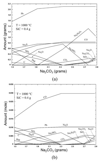 The first approach in thermodynamic modeling was performed considering that the lead contained in the lead concentrate correspond to PbS, since it would represent the most difficult lead compound (compared either with lead oxides or lead sulfate) to be reduced by the proposed mixtures of Na2CO3 and SiC. The thermodynamic trials of the direct smelting reduction process were carried out to 2.45 g PbS which are contained in 4 g of lead concentrate and 0.4 g of SiC, both amounts were held constant while the amount of Na2CO3 was evaluated in the range from 1.5 to 2.88 g. Figure 10 show the equilibrium diagrams obtained in grams and mole, respectively, when the initial compounds reach the thermodynamic equilibrium at 1000 °C.
