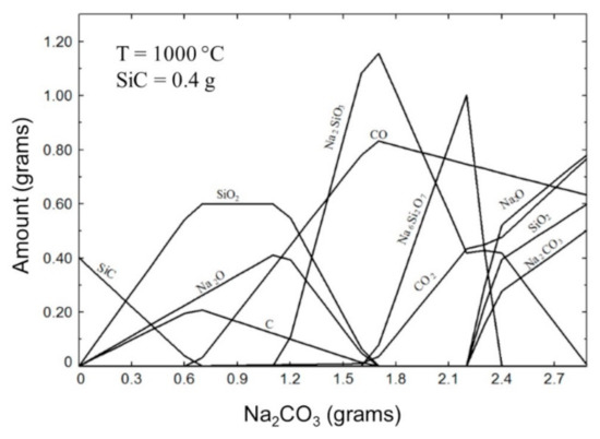 Interaction for stoichiometric amounts between Na2CO3 and SiC is addressed in reaction (3). Nevertheless, the experimental parameters used in this research were explored to 1000 °C and for non-stoichiometric amounts of Na2CO3 and SiC that lead to the formation of C, CO, SiO2, Na2O, and sodium silicates. Thermodynamic calculation in FactSage 7.3 was done to explore the theoretical products that could be formed for the reaction of 0.4 g of SiC to different additions of Na2CO3 at 1000 °C, as is shown in Figure 11. The initial 0.4 g of SiC are totally reacted with 0.6 g of Na2CO3 to form C, SiO2, and Na2O. With this addition of Na2CO3, the formation of CO starts. To 1.7 g of Na2CO3, the amount of SiO2 and Na2O decreases almost totally and the sodium silicate structure Na2SiO3 together with CO are the main compounds formed, in this point the generation of CO2 takes place. Amounts between 1.6 and 2.4 g of Na2CO3 allows the presence of a second sodium silicate structure Na6Si2O7, which between 2.2 and 2.4 g of Na2CO3 decomposes to form again SiO2, Na2O, and unreacted Na2CO3 also appears. The amount of SiO2, Na2O, and unreacted Na2CO3 increases as the addition of Na2CO3 increases. The Na2SiO3 decreases from 1.8 to 2.8 g of Na2CO3, which is attributed to the partial formation of the second silicate structure and to the increase of SiO2 and Na2O.
